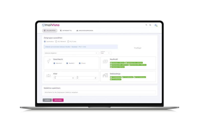 mailVista ist die smarte Komplettlösung für Ihren Postmailingversand: kinderleicht, kosteneffizient und selbstverständlich DSGVO-konform. Mit nur wenigen Klicks können Sie Adressen gezielt selektieren, individuelle Werbemittel erstellen und diese direkt in den Druck sowie Versand geben.